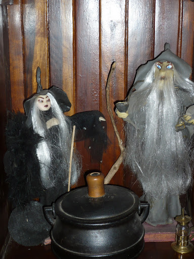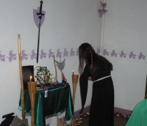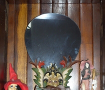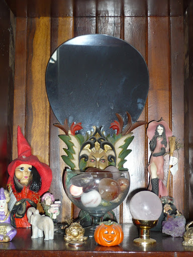 Na frente, um grande espelho. Ao lado, um altar que tem a presença dos quatro elementos. O cálice representa o feminino e a água também. A pena simboliza o elemento ar. O sal, a terra. O átame, que é o punhal, significa o masculino. A vela, o fogo. A varinha é o elemento ar que serve para emanar energia, e logo abaixo um caldeirão – chamado também de útero da ‘Grande Deusa’.