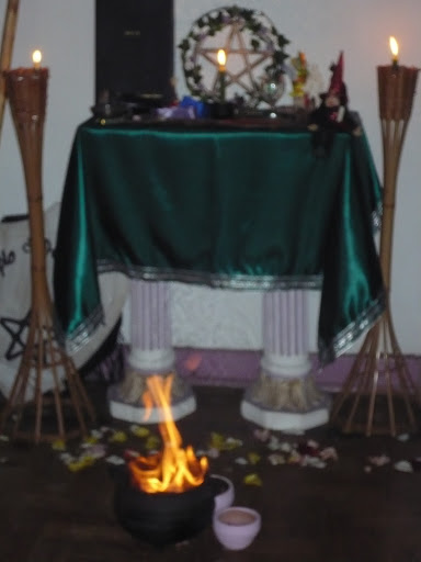 O caldeirão representa a Deusa, o útero. Serve para fazer poções e queimar os pedidos. O fogo também é aceso para tirar as energias negativas e doenças.