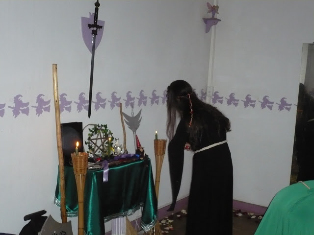 No recinto é necessário tirar os sapatos para não poluir o espaço, já preparado para a cerimônia. Primeiro são chamados os representantes dos quatro elementos: terra, fogo, água e ar. Em seguida, os outros praticantes entram um por vez e recebem uma benção da sacerdotisa wiccana. Em círculo e de mãos dadas é iniciado o ritual de ‘Beltane’.