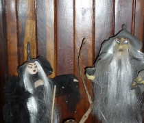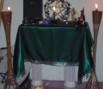 Na frente, um grande espelho. Ao lado, um altar que tem a presença dos quatro elementos. O cálice representa o feminino e a água também. A pena simboliza o elemento ar. O sal, a terra. O átame, que é o punhal, significa o masculino. A vela, o fogo. A varinha é o elemento ar que serve para emanar energia, e logo abaixo um caldeirão – chamado também de útero da ‘Grande Deusa’.